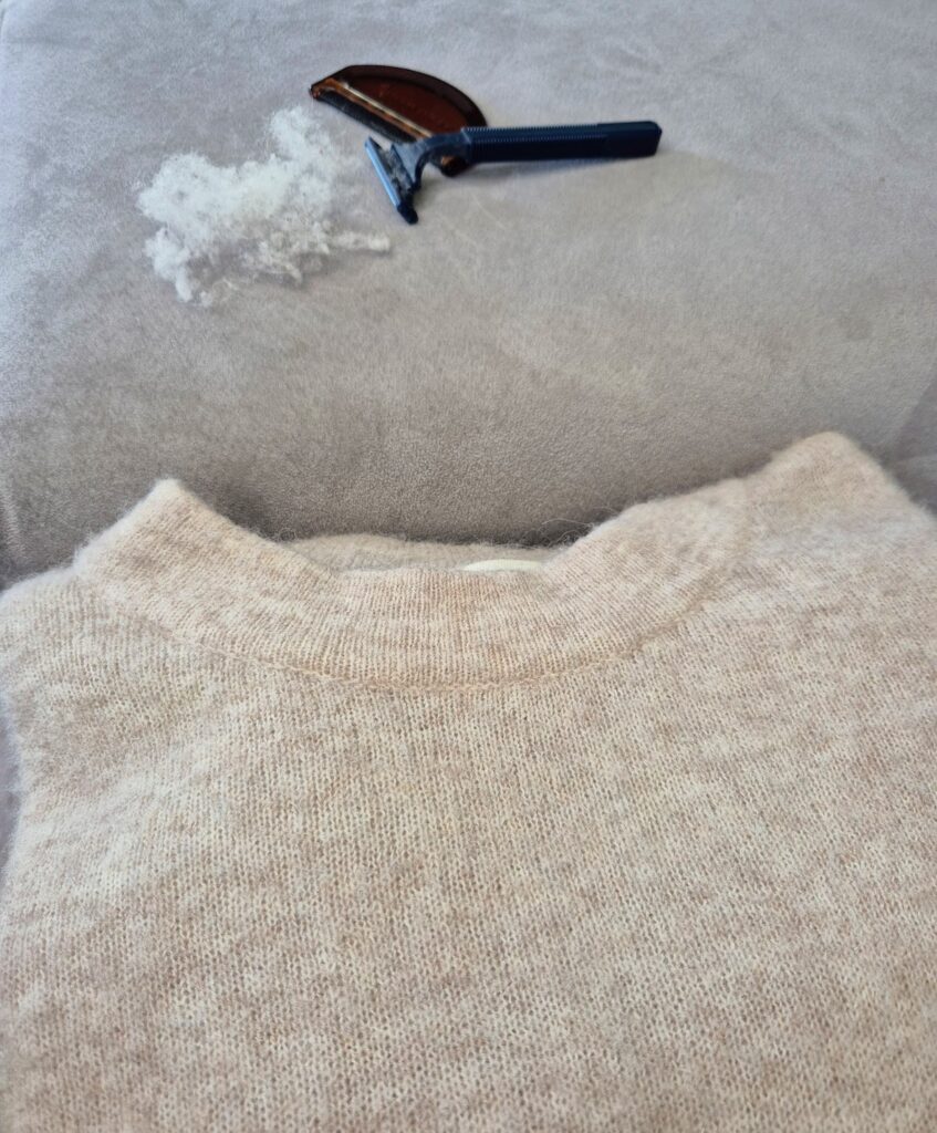 Villakampa saa neuleen pinnan pörhöytymään jonkin verran ja lopuksi teinkin niin, kun nypyt olivat suurimmaksi osaksi poistettu, että viimeistelin työni kertakäyttöterällä. Eli vedin rennosti, mutta varovasti terällä vielä kerran paidan pinnan läpi. Pinta näytti kuin näyttikin astetta paremmalta ja sileämmältä sen jälkeen.