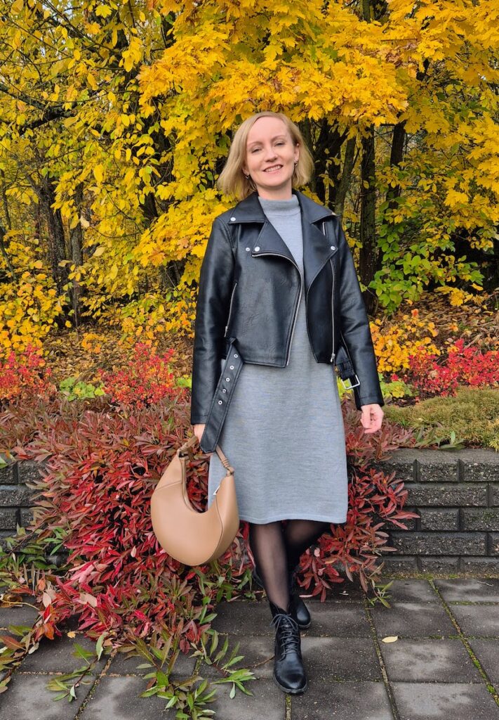 Vaalea laukku tosiaan sopii tähän asuun täydellisesti rikkomalla monocromista kokonaisuutta kivasti. Ja villa sopii syksyyn, viileä kun alkaa olemaan ulkona. Itse en huomaa mekossa mitään vikaa. Löysemmästä päästä vaatteita on välillä kiva pitää, pääsee rentoutumaan kun mikään ei purista mistään ja saa syödä lounaan rauhassa 😊.