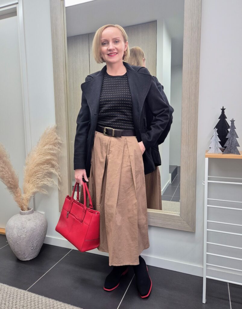 Aluksi yritin pukea usein suosimaani polvipituista ulkotakkia tämän hameen kanssa, mutta ei. Ei se oikein sattunut silmään, mutta hieman lyhyempi villakangastakki sopi. Paras olisi ollut lyhyt takki, mutta lämpöisempää lyhyttä takkia en omista. Tykkään, että näillä keleillä alaselkä ja pehvakin pysyvät lämpöisinä.