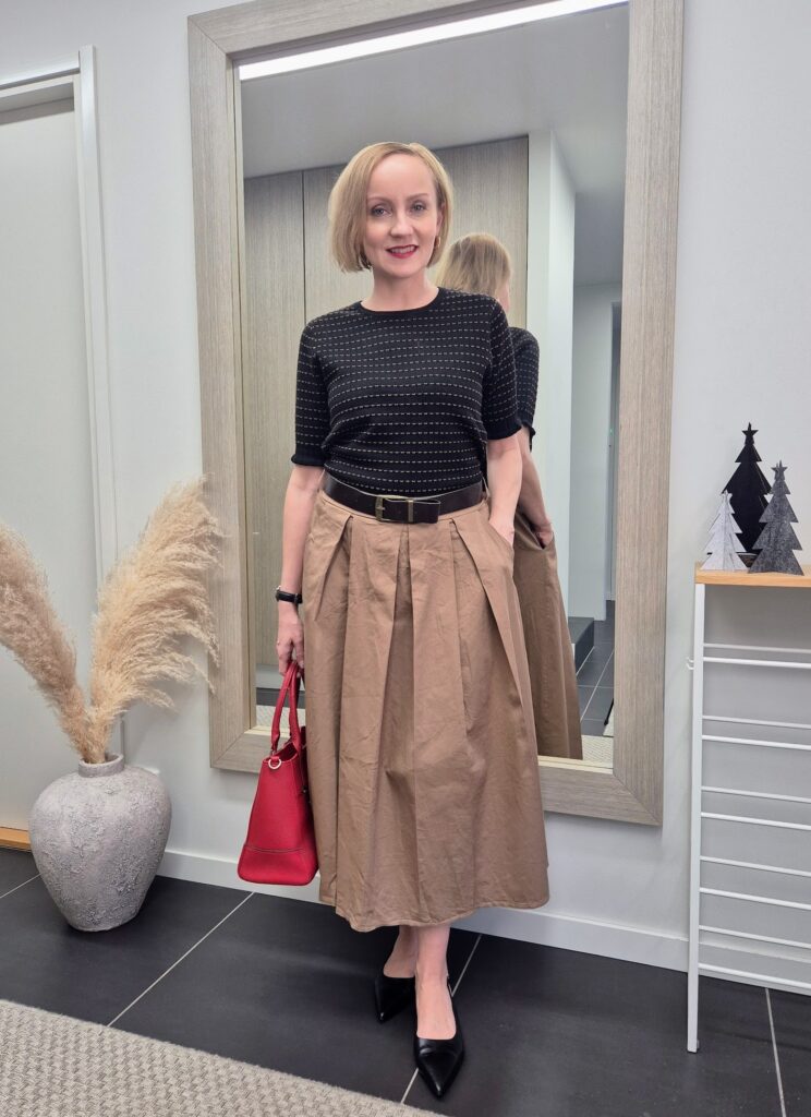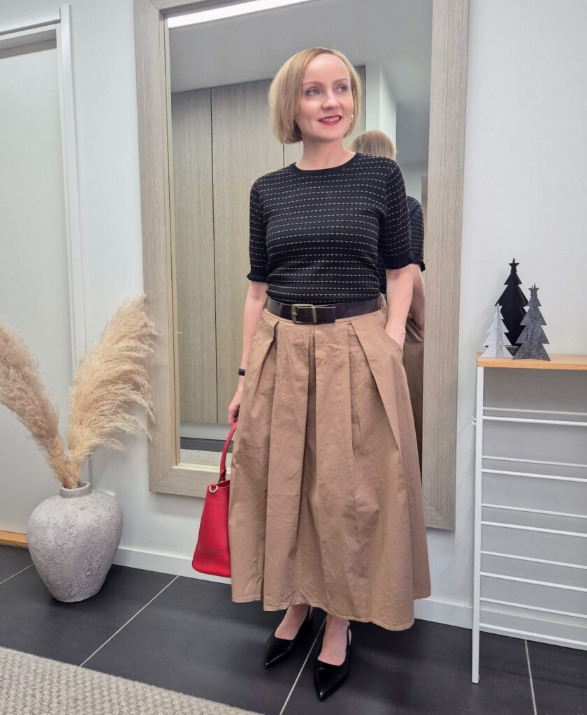 Joistain nuoruuden trendeistä sitä tykkää ja joitain päin ei voi edes katsoa, kun tulevat uudelleen muotiin. En nyt kovin usein näin pitkää hametta käytä, mutta tässä tykkään hameen muodosta ja maanläheisestä väristä. Tosin väriläikkänä tuo punainen tekee hyvää kokonaisuudelle.