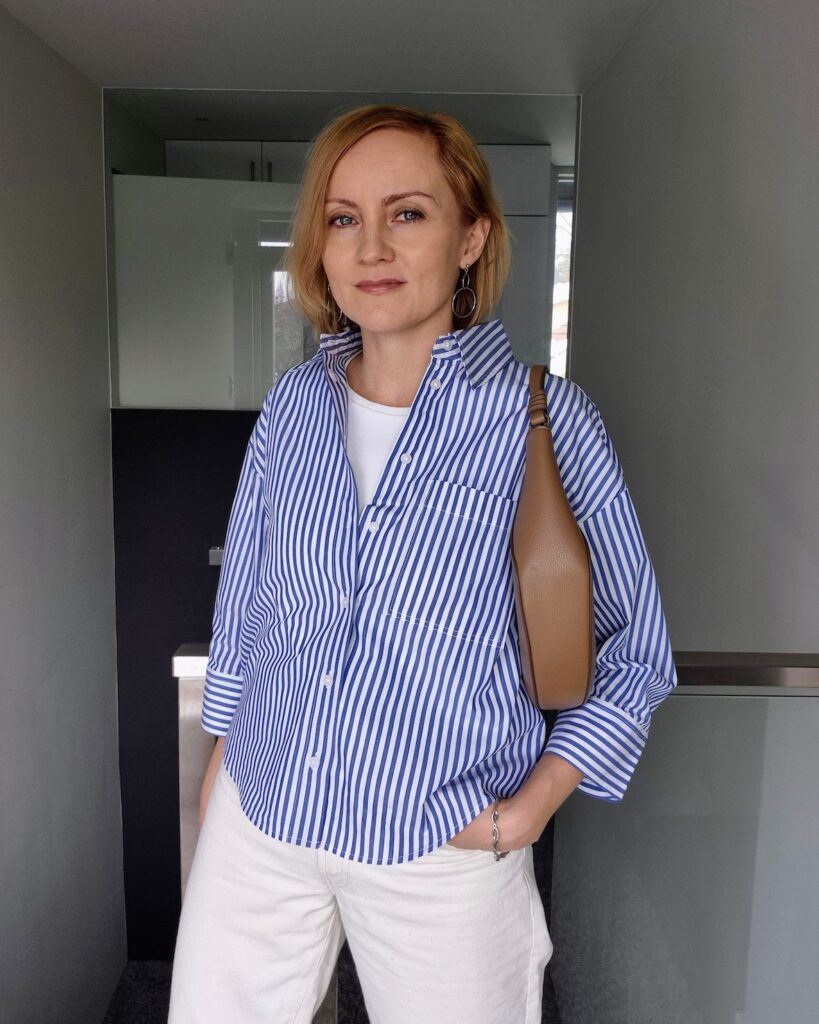 Tämänpäiväisen raitapaitani hihat ovat lyhyemmät kuin tavallisesti eikä hihoja tarvitse kääriä, niin kuin usein kauluspaidoilleni teen. Itse asiassa tämän paidan helmakin on tavallista lyhyemmäksi jätetty. Yleensä työntelen helman housun tai hameen sisälle, paitsi kesällä, kun paita voi olla rennosti auki paljastaen raikkaan valkoisen t-paidan.