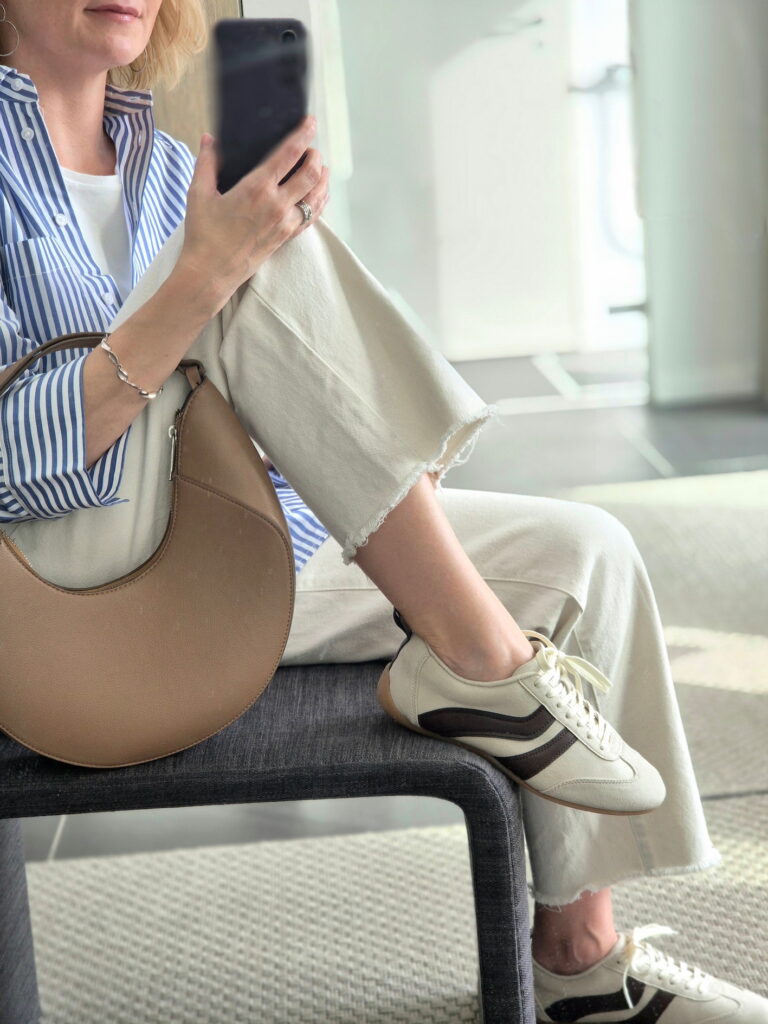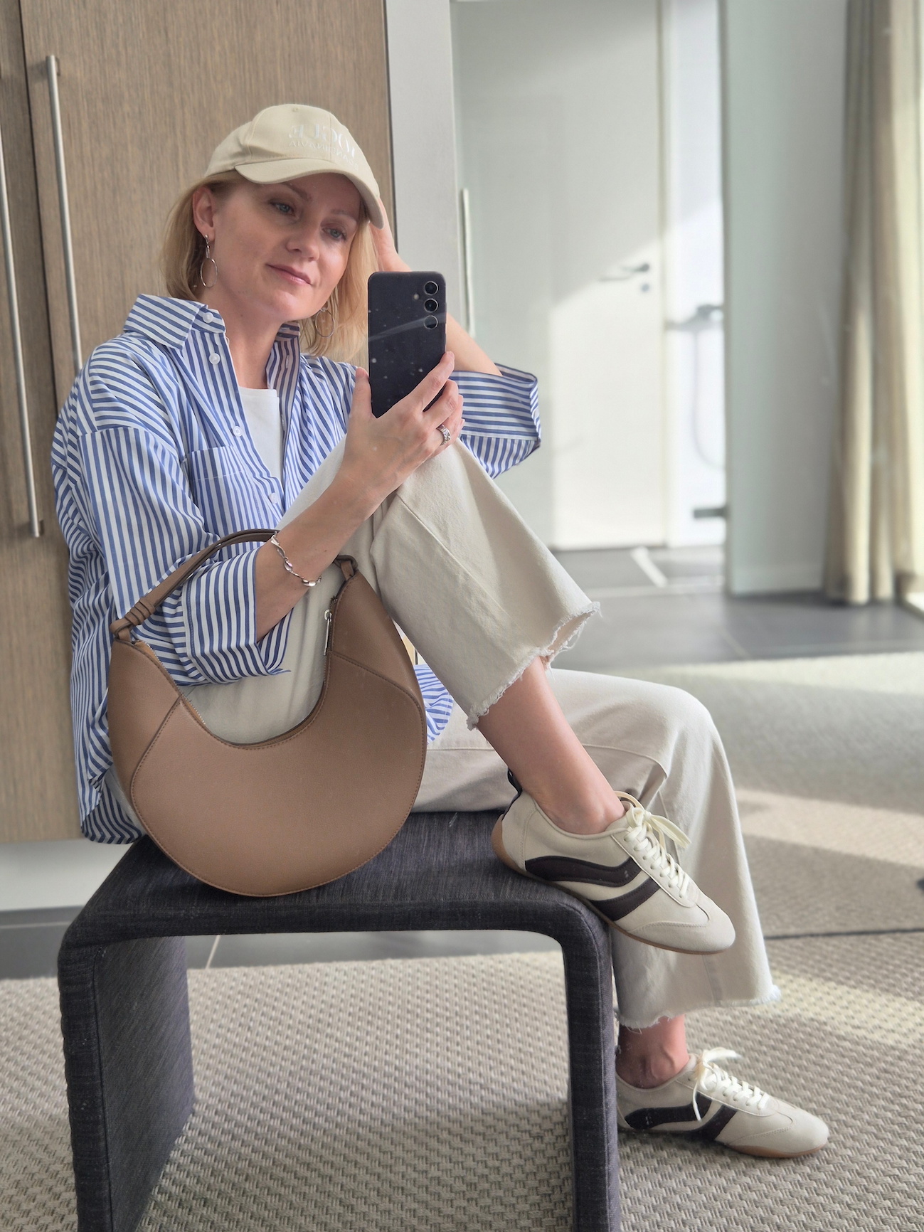 Ylläni on Kaikon klassikko t-paita valkoisena, joka on sellaisesta paksummasta kankaasta tehty. Raitapaita ja kengät ovat H&M ja housut Lindexiltä. Laukun ostin itselleni tuliaiseksi toissa vuonna Karibialta.