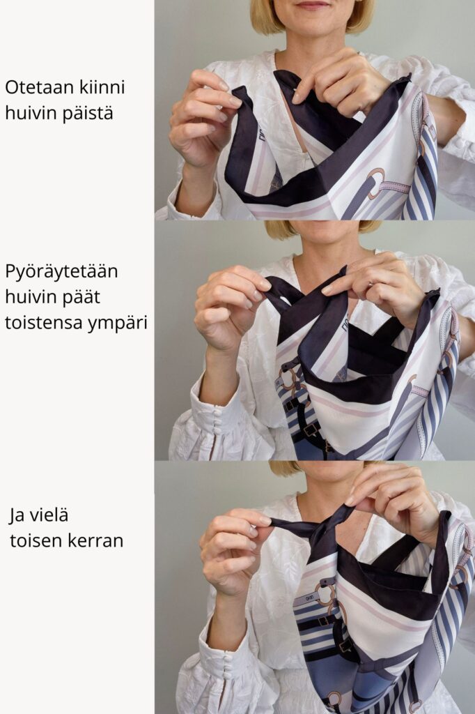Huivi niskan taakse ja aletaan nostaa huivin sivuja kohti otsaa. Pidempitukkaisen kannattanee laittaa tässä vaiheessa ponnari ja lopuksi avata se, jolloin huivin takaosa jää mukavasi hiusten alle piiloon.