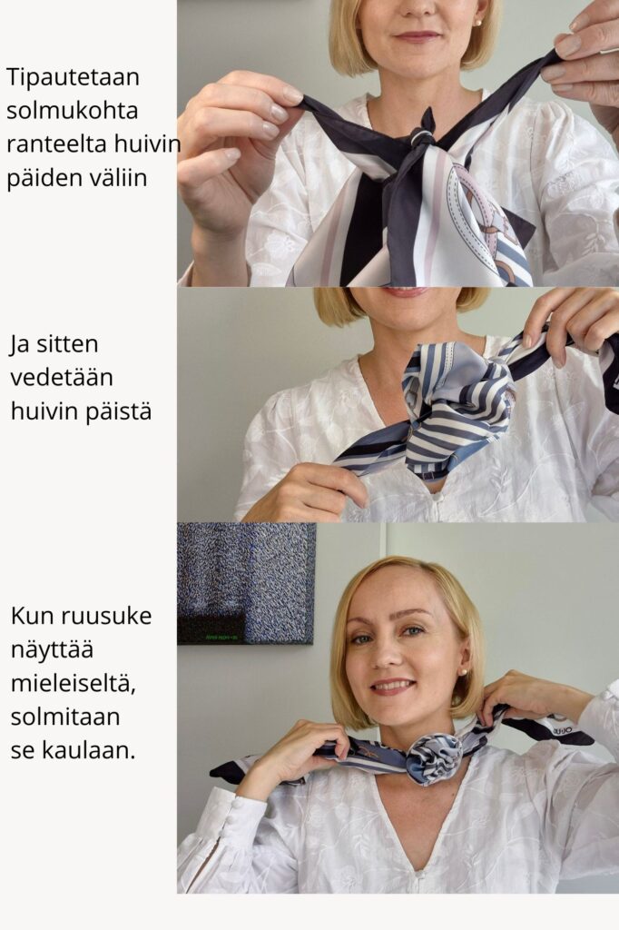 Ruusuke ei synny niin sanotusti itsestään. Henkilökohtaisesti tein aluksi sen virheen, että vedin huivin päistä tasatahtia, jolloin tarvitaan tuuria, että ruusu muotoutuu nätiksi. Eli harjoittelua ja huivin päiden vetoa hieman vaihtelevalla vedotahdilla. Jos ruusuke näyttää epäsuhdalta, etsi huivista kohta, josta vetämällä saa juuri sen kohdan pienenemään. Tämä asia selviää parhaiten kokeilemalla ja harjoittelemalla.