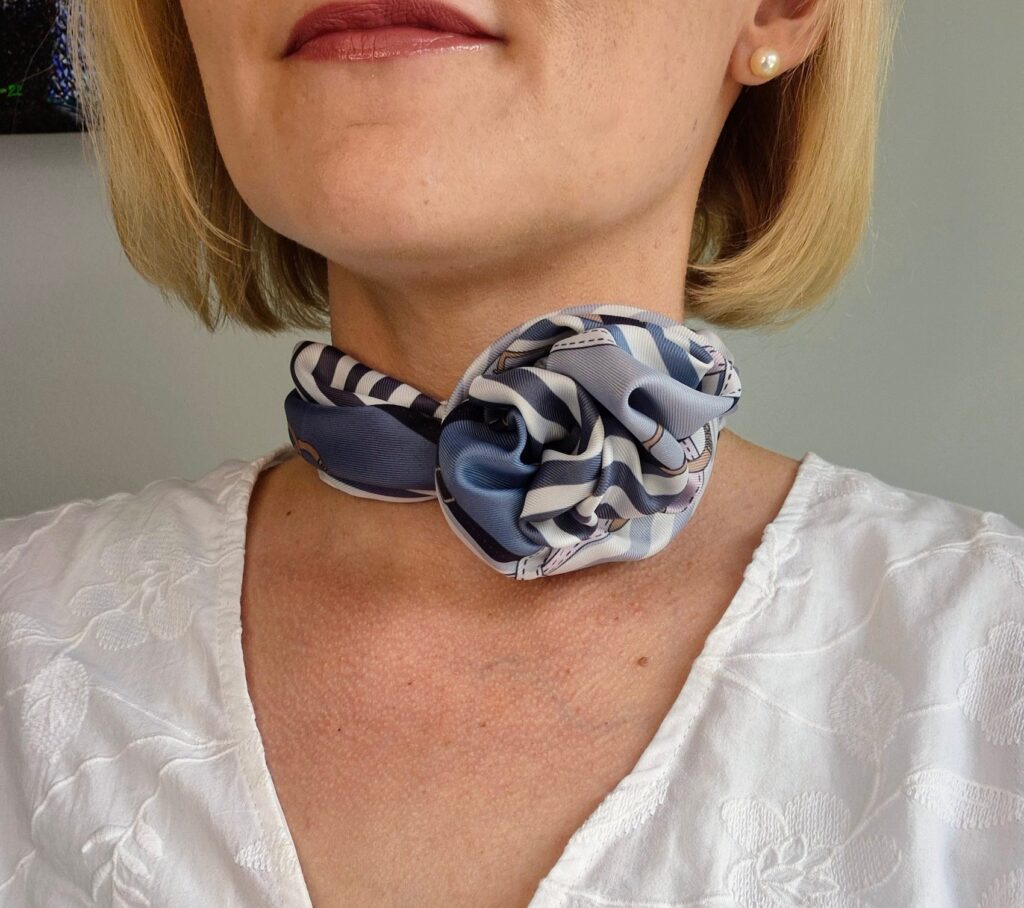 Näin saadaan kivaa vaihtelua vaikkapa juuri sen kaulakorun käyttöön. Eri värisillä huiveilla saa aikaan mitä paremmannäköisiä kukkakoristeita kaulaan. Eikä taida tulla ihan jokaisella sama vastaan.
