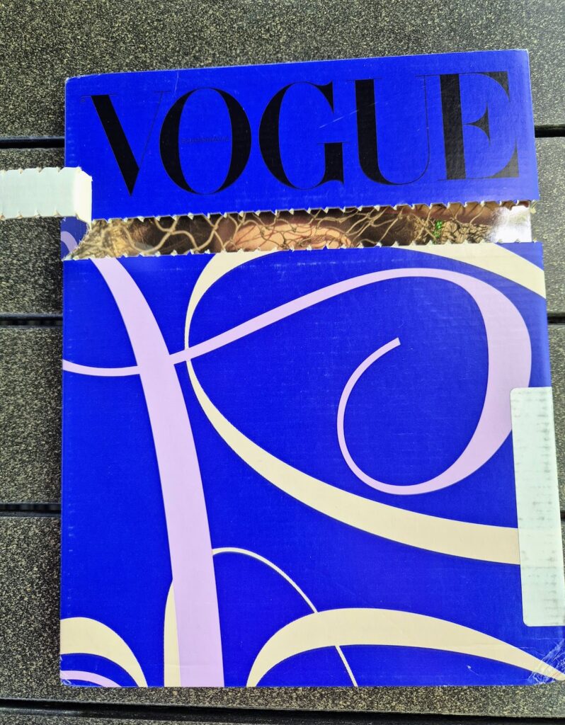 Olen toisinaan lehtipisteeltä ostanut Vogue-lehtiä (milloin Iso-Britannian, milloin jenkkiversion) inspiraatiota varten ja nyt onkin ihan kätevää, kun tämä yksilö kannetaan kotiin asti. Olin reissun päällä kesäkuun alun, kun uusin lehti saapui. Vogue on kääräisty pahvimaiseen kuoreen, jonka Stora Enso on valmistanut uusiutuvasta puukuidusta. Ei siis muovikääreitä tällä kertaa.