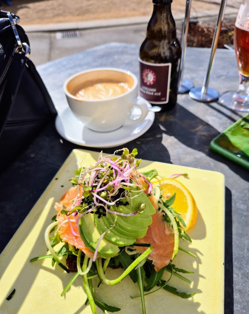 Mies kävi sisältä tilaamassa meille smörrebrödit, minulle kahvia ja hänelle jonkin erikoisoluen, tuttuja merkkejä ei kuulemma ollut saatavilla. Siinä ulkona aikani katselin, kun tyttö kantoi ja kantoi cappuccinoa. Eihän se minun ole, kysyin ja hän katsoi pyödän numeroa. Ei se numero tainnut tuo olla, hän mutisi ja meni takaisin sisään. Hetkosen kuluttua nuori mies marssi sisältä samaisen cappuccinon kanssa samat polut ja tuli lopulta luokseni. Ennen kuin pystyin hillitsemään sanoin, se on varmasti kuumaa se. Hän ei vastannut. Eikä se juoma tietenkään lämpöä ollut nähnytkään. Sen verran ahkerasti sitä oli ulkoilutettu ennen minun eteeni päätymistä. Mutta leivät olivat erinomaiset ja aurinko paistoi niin kovasti, että melkein lämmitti sen cappuccinon uudelleen.