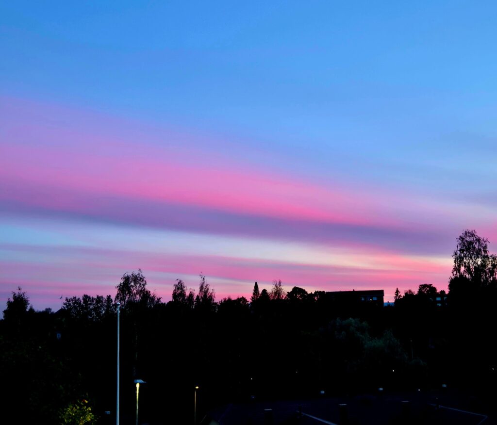Tällä viikolla oli komeita auringonlaskuja useita sekä olisi niitä revontuliakin ollut, jos olisi iltamyöhiin päässyt niitä bongailemaan. Omasta pihasta yritin tiirailla lasten nukkuessa, mutta ei juuri sillä hetkellä näkynyt.