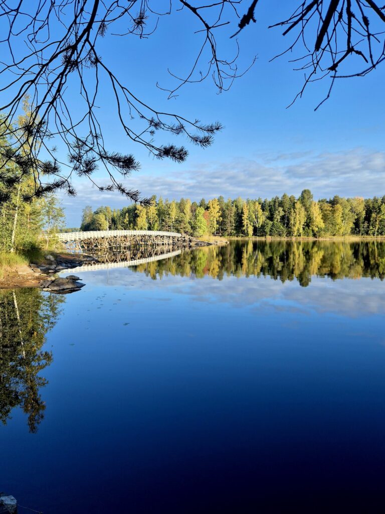 Mutta lunta en kaipaa vielä, todellakaan. On ollut ilo kulkea metsässä, yksin ja lasten kanssa. Eräänäkin päivänä oli niin tyyntä. Veden pintaa olisi voinut leikata. Miten hienolta täydellinen heijastus veden pinnalla näyttää.