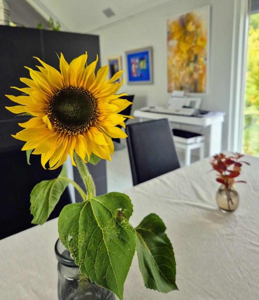 Viikko meni tässä lasten kanssa keskenämme pyöriessä, koska mies oli reissuhommissa. Ja hyvinhän tuo viikko meni, onneksi. Jotain köhää on yrittänyt tulla perheeseen, mutta nyt näyttäisi, että ne vaivat eivät olleet jäämässä. Silitin pitkästä aikaa pellavaisen pöytäliinan pöytään ja pihalta poimitut punaiset lehdet tuovat omalta osaltaan syksyn tuntua sisällekin. Yksi auringonkukkakin sinnittelee vielä maljakossa.