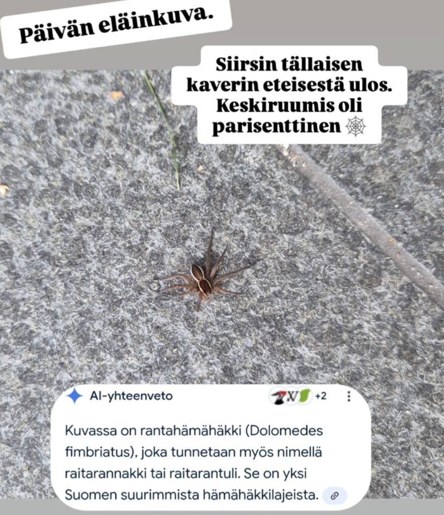 Eläinkunnan edustajia on piisannut niin ulkona kuin sisälläkin. Viime aikoina rusakot, ketut ja oravat tuntuvat olleen kovastikin syyspuuhissa ja ne vilistävät päivittäin menemään pitkin pihaa ja terasseja. Sisätiloista juniori bongasi aika ison hämähäkin, jonka nostin äkkiä ulos. Google tiesi kertoa sen olleen rantahämähäkki. Tavalliset hämähäkit sen sijaan saavat meillä asua. Toivon mukaan popsivat kaikenlaista ötökkää, jos niitä nurkissa pyörii.