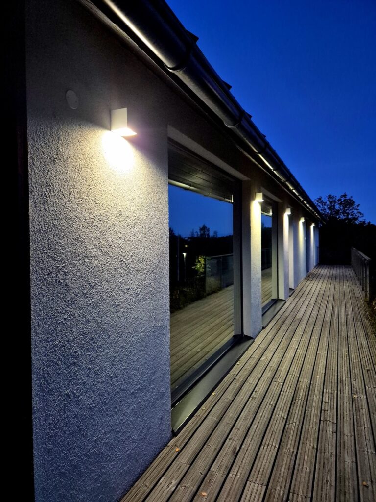 Uudet ulkovalot talon seinässä näyttävät oikein kivoilta. Valot olisi saanut ylöspäinkin näyttämään, mutta emme kokeneet sen olevan tarpeen. Yllättävän paljon valoa irtoaa ihan näinkin.