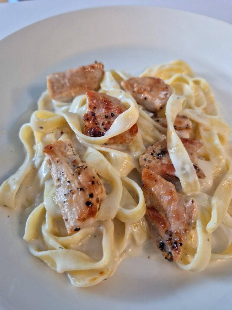 Pasta Alfredo koostuu perinteisesti kolmesta raaka-aineesta (nauhapasta, kerma ja Parmesan-juusto), mutta itse ainakin toisinaan kaipaan niiden lisäksi vielä jotain muuta. Onneksi joku jossain on keksinyt lisätä kanaa reseptiin ja lukuisten eri variaatioiden keskeltä olen seuraavanlaiseen perusversioon päätynyt.