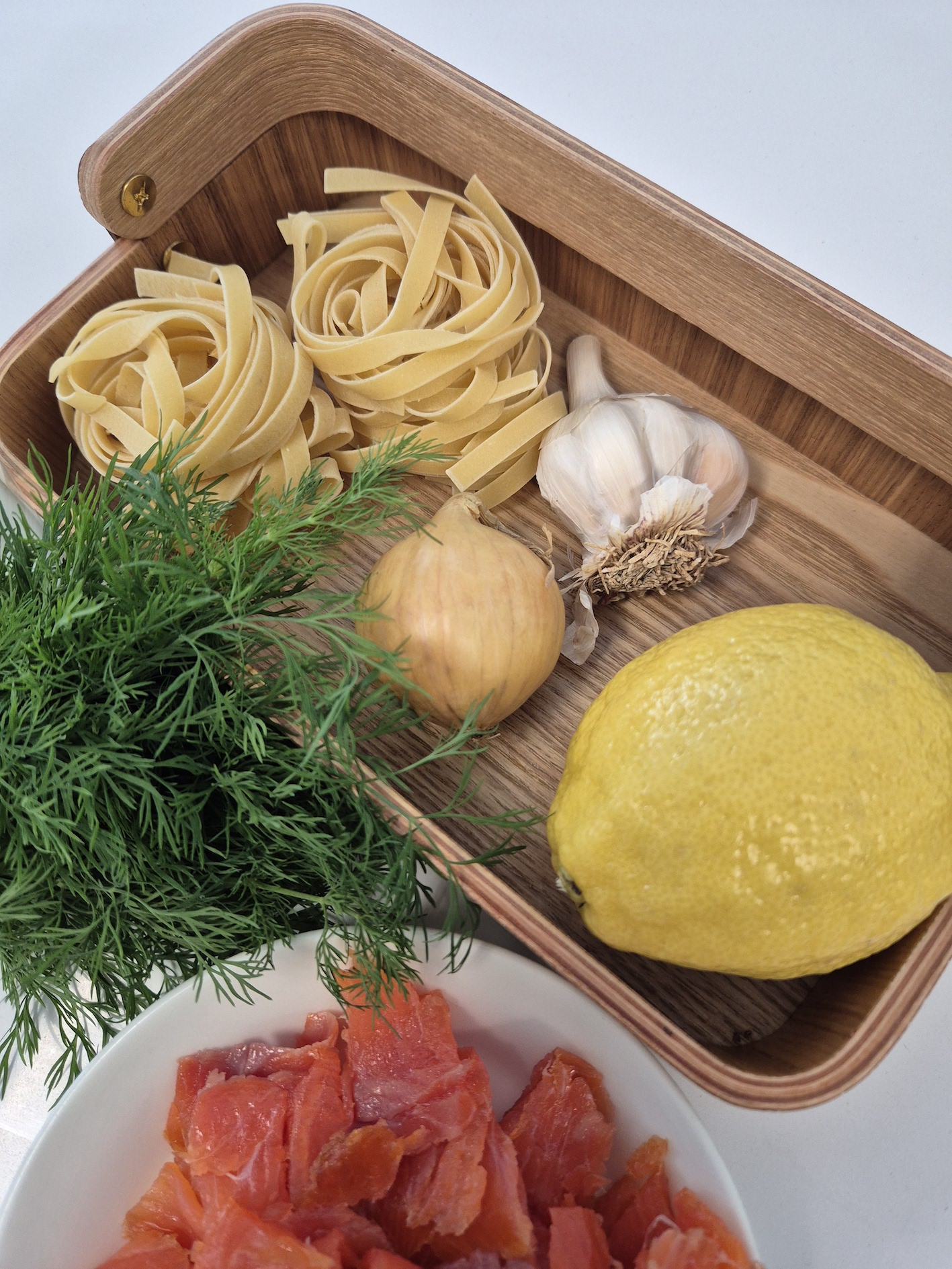 Pilkotaan kylmäsavulohiviipaleita pienemmäksi. Hienonnetaan sipuli ja valkosipuli. Laitetaan pannulle oliiviöljyä ja kuullotetaan sipuleita. Ei ruskistusta. Lisätään sitruunan raastettua kuorta, situunamehu, kerma ja desi viiniä pannulle. Kuumennetaan kiehuvaksi. Lopuksi lisätään kylmäsavulohi ja maustetaan mustapippurilla. Maun mukaan voi lisätä suolaa, lohi on suolaista jo valmiiksi. Siirretään pois levyltä. Runsaasti tillisilppua päälle ja nauttimaan.