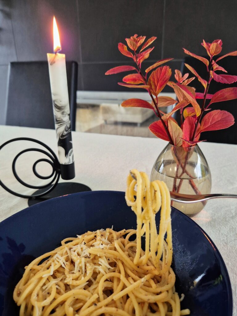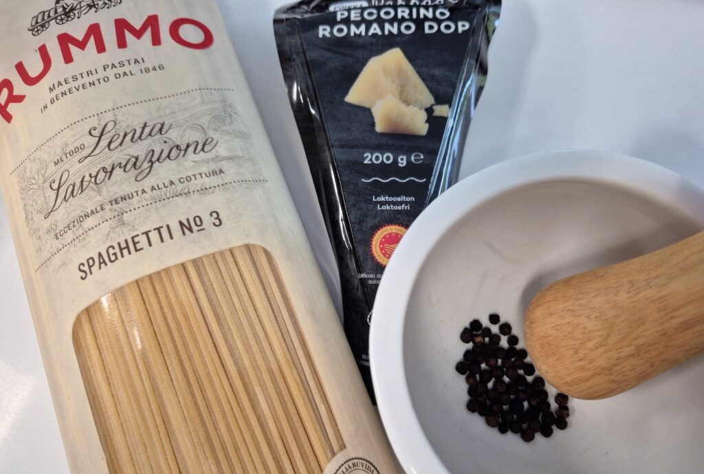 Cacio e pepe on yksi italialaisen keittiön yksinkertaisimmista ja suosituimmista peruspastoista. Nimi ”juustoa ja pippuria” kertoo kaiken oleellisen. Pasta on herkullista ja se valmistuu vain muutamia ainesosia käyttäen. Pastaan kuuluisi valita tonnarelli-pastaa, mutta kas kun se on päässyt kotikeittiössä loppumaan (liekö ikinä ollutkaan), niin valitsen toisen hieman karheapintaisen vaihtoehdon, eli Rummon spagetin tällä kertaa.