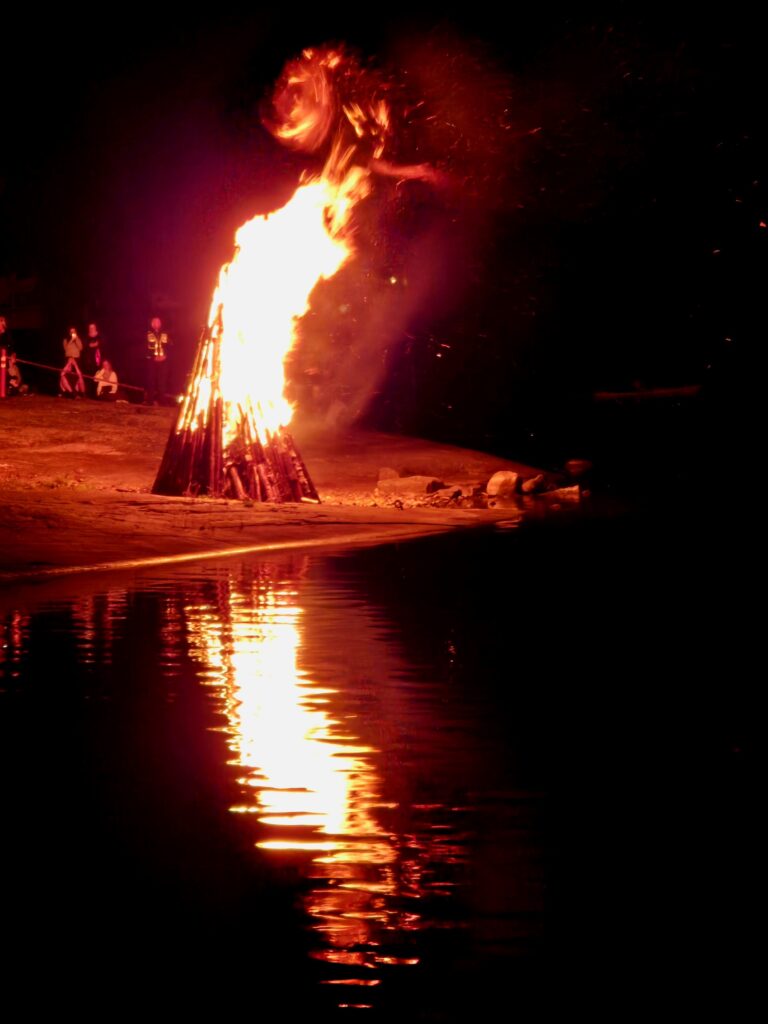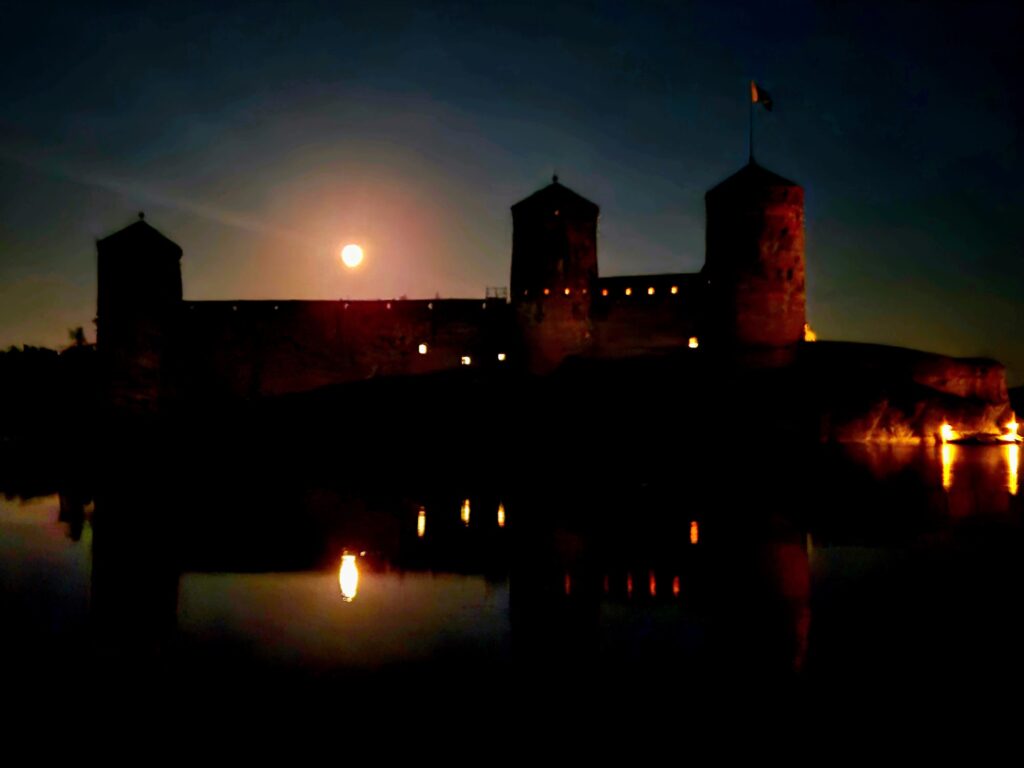 Lopuksi syystulien kokko sytytettiin ja miten onkin aina mukavaa seurata tulen leikkiä. Poislähtiessä oli vielä pysähdyttävä Olavinlinnaa ihailemaan. 550-vuotias linna näytti kerrassaan hienolta kuun valossa, pieniä valoja ikkuna-aukoissaan. Eivät saaneet ilmeisesti valloitettua silloin päivällä, vaikka tykin jylinät kovia olivatkin.
