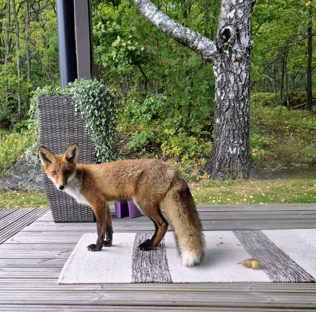 Ei mennyt montaakaan päivää, kun näin terassilla liikettä. Aivan takaoven luona, joka oli kiinni sillä kertaa, istui kettu. Kettu oli löytänyt muutaman päärynän, jotka olivat jääneet ulos rasiaan. Se popsi niistä muutaman, mikä oli ihan ok, mutta päätin kuitenkin lopulta astella itsekin terassille. Kettu hypähti portaat alas ja meni nurmikolle istumaan ja katselemaan minua. Olimme nimittäin löytäneet kakkaa pihakivetyksiltä ja kulkuväyliltä, ja yhdistin ne nyt kettuun. Sanoin sille, että voisi mennä muualle kakkimaan. Muutoin olisi tervetullut. Se katseli ja kuunteli, rapsutteli hetken itseään ja lähti sitten naapuriin. Aika kesy tapaus siis. En tiedä uskoiko minua, mutta tämä kakkashow alkoi jo vähän kyllästyttämään. Vaikka kivojahan eläimet ovat.