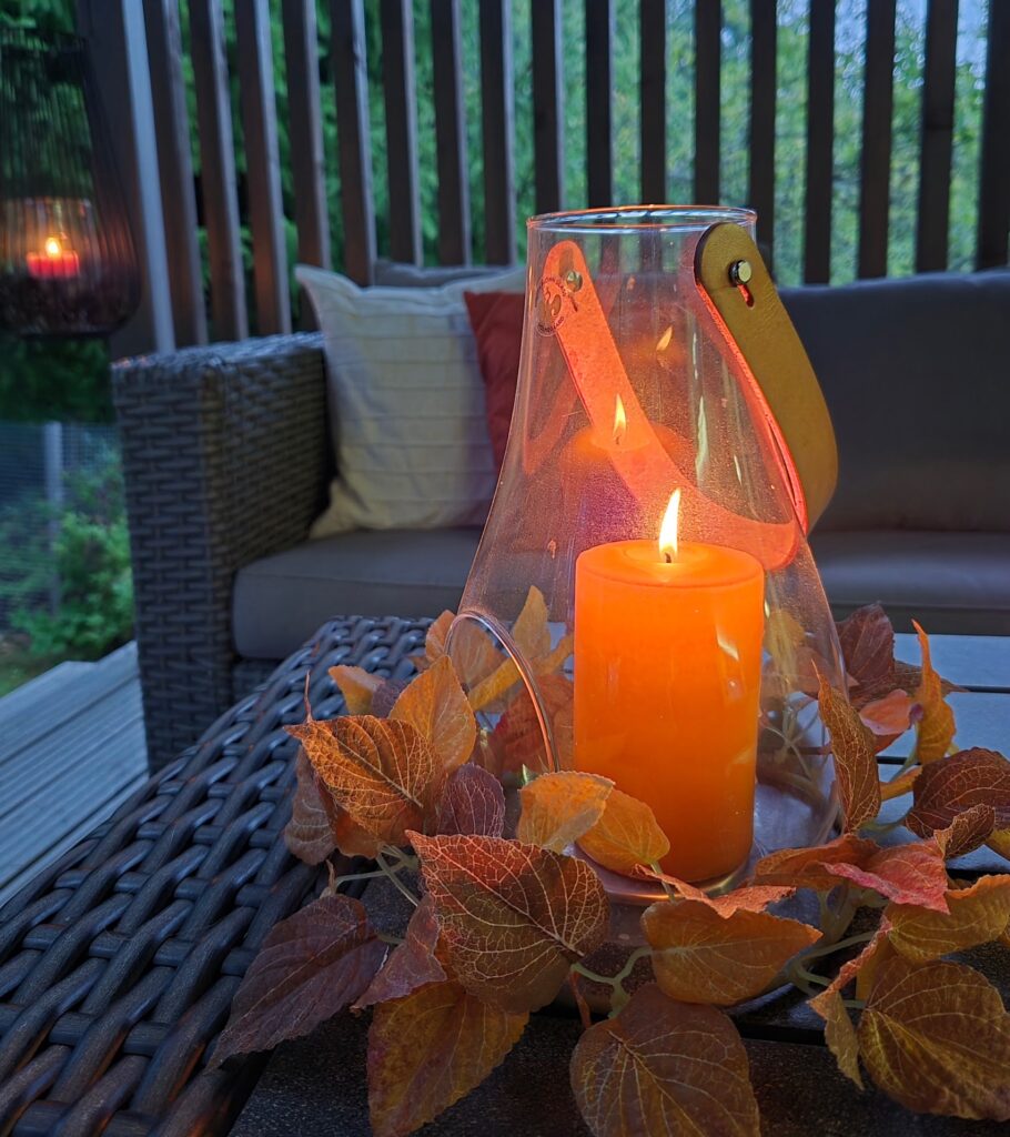 Olen syksyisiä elementtejä alkanut ottaa esille ja pimeän hiipiessä sytytellyt tunnelmatulia. Ovathan ne kauniit, kun vain muistaa ostaa ensin kynttilöitä ja sitten vielä laittaa niihin tulet. Tietty tunnelmallisuus auttaa myös sietämään hämärää aikaa, joka ei todellakaan ole suosikkejani.