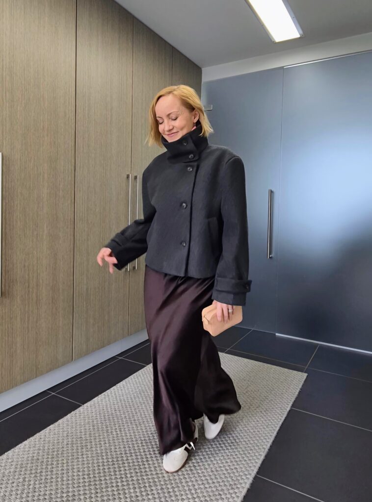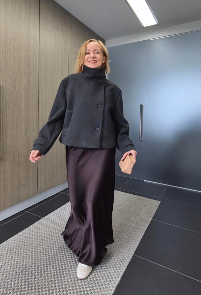 Olen todella tykästynyt kuvissa näkyvään ruskeaan Lindexin satiinihameeseen, joka näyttää aina vain niin hyvältä. Jalkaan voi laittaa nilkkuria tai tennaria – tilanteen mukaan. Harmaa kevättakki on Zaralta. Korkea kaulus, niin ei tarvitse kaulahuivia.