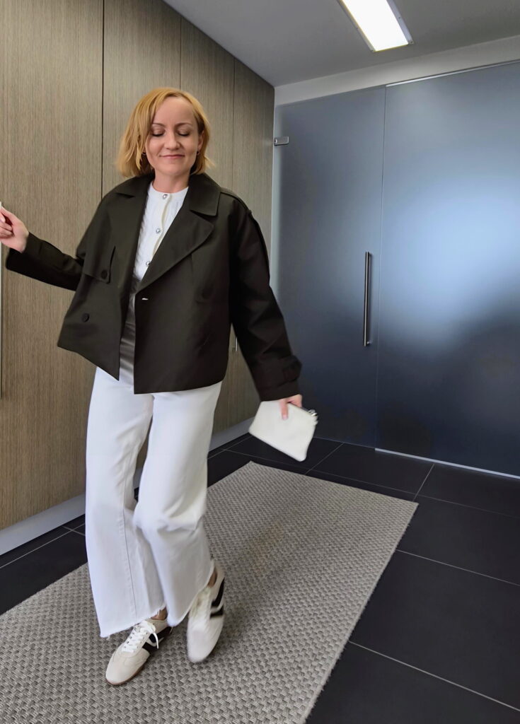 Ylemmässä kuvassa ylläni on khakin värinen, lyhyenmallinen trenssi, joka näkyi myös edellisessä blogipostauksessani. Kätevä heittää ylle niin kauppareissulle kuin ravintolaan.
