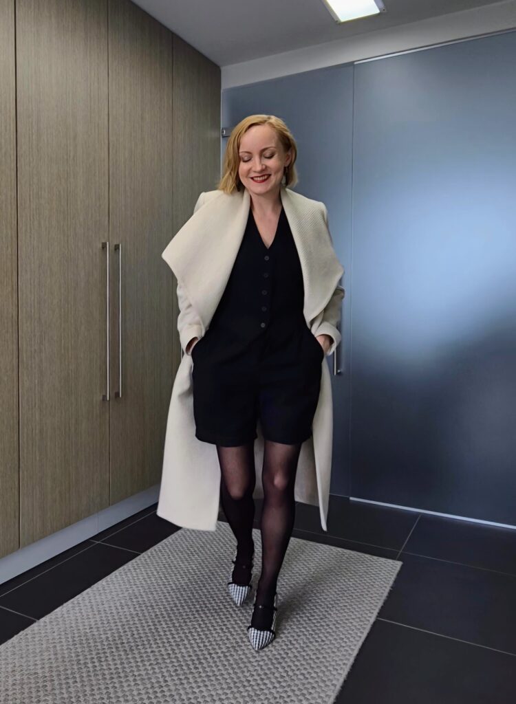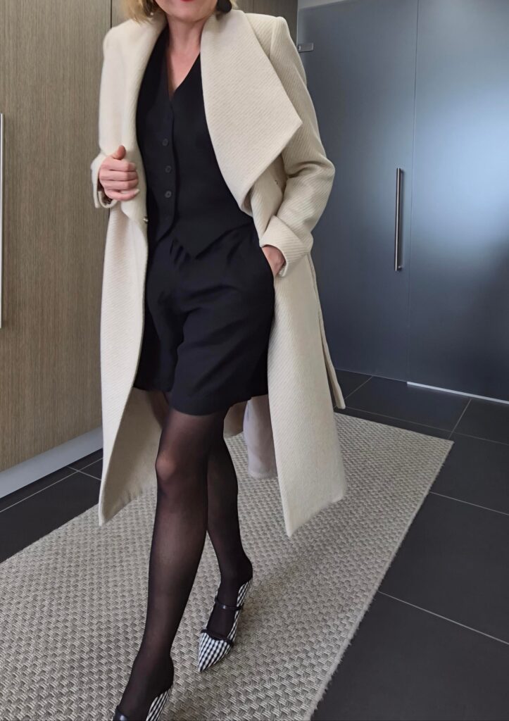 Kinttuja saapi paljastella trendien mukaan, mutta taktisesti vetäisin shortsieni kaveriksi tummat sukkahousut. Vähän kylmä olisi olla vain paljain jaloin. Lyhyet hameet ja tyylikkäät shortsit ovat kevätmuotia, ainakin eteläisimmissä Euroopan maissa, ja aina välillä tekee mieli itsekin kokeilla. Olen yleensä omassa pukeutumisessani pidempien helmojen ystävä, mutta tässä asussa vain takki läpäisee ne kriteerit.