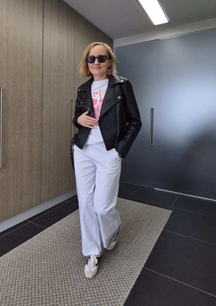Nahkatakinkin saa ihan kohta kaivaa esiin. Kaivoin nyt toisen omistani esiin, jotta se on valmiina, kun oikein lämmin päivä sattuu. Mitäs se lämmin sää voisi keväällä tarkoittaa, +14? Keväiset plussa-asteet tuntuvat aina lämpöisemmiltä kuin vastaavat syksyllä. Ja suorassa kevätauringossahan sitä suorastaan sulaa, joten vitivalkoisten vaatteiden käyttö on suorastaan perusteltua.