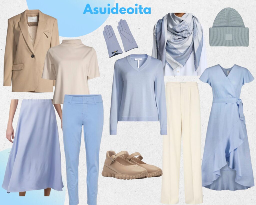 Upea vaaleansininen, erityisesti jäänraikas sävy on ajankohtainen tällä hetkellä naisten pukeutumisessa ja tämä väri sattumoisin sopii allekirjoittaneelle kuin nenä päähän. Vaaleansinistä käytän siis yläosissa, ja yhtä lailla alaosissa. Kaikille vaaleansinisen sävy ei sovi lähelle kasvoja, jolloin kaunis vaaleansininen kannattaa valita housujen, hameen tai asusteiden värisävyksi.