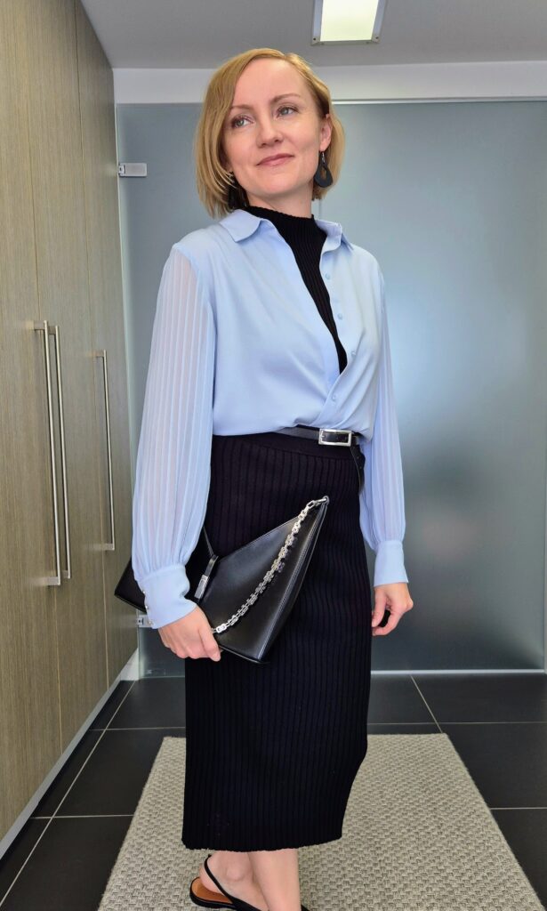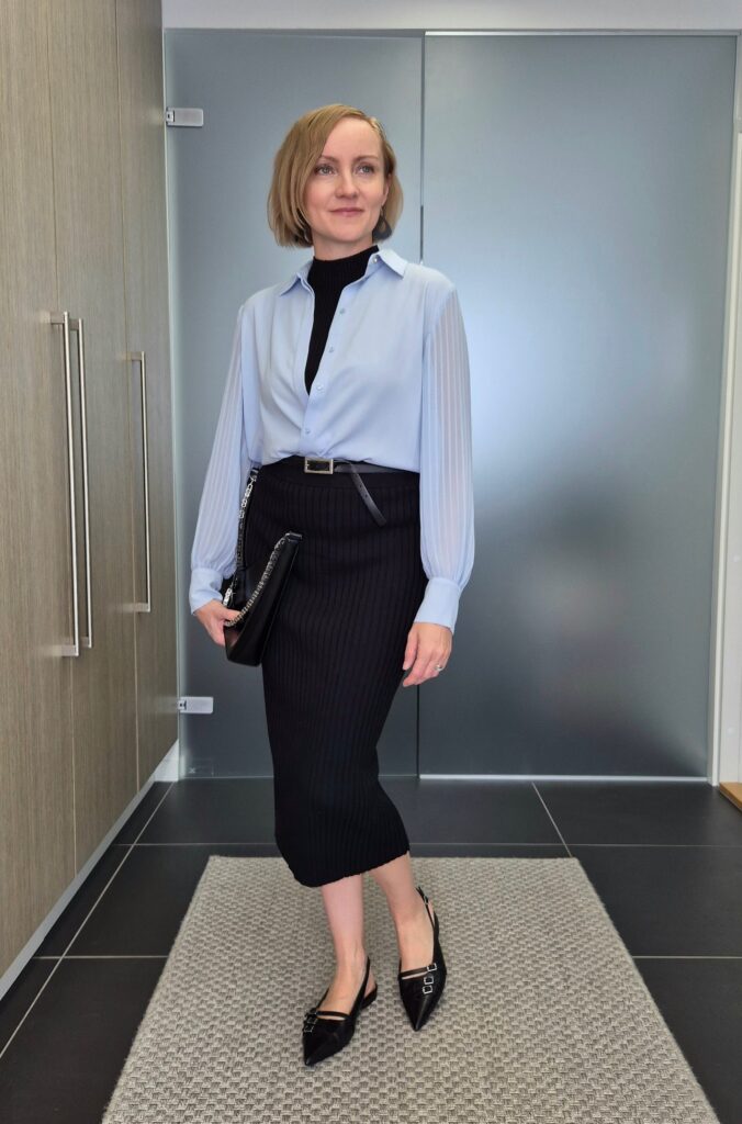 Musta ja vaaleansininen onkin jännä pari. Vaaleansininen nousee ihan eri tasolle kuin yhdistettynä toisen vaalean neutraalin värin kanssa. Ne, jotka suosivat mustaa pukeutumisessaan voisivat joskus kokeilla rohkeasti lisätä väriä päivän asuunsa. Esimerkiksi juuri tämä vaaleansininen ei näytä yhtään liian lempeältä tai hempeältä, kun se on mustan vieressä. Ainoastaan saa asun näyttämään paremmalta.