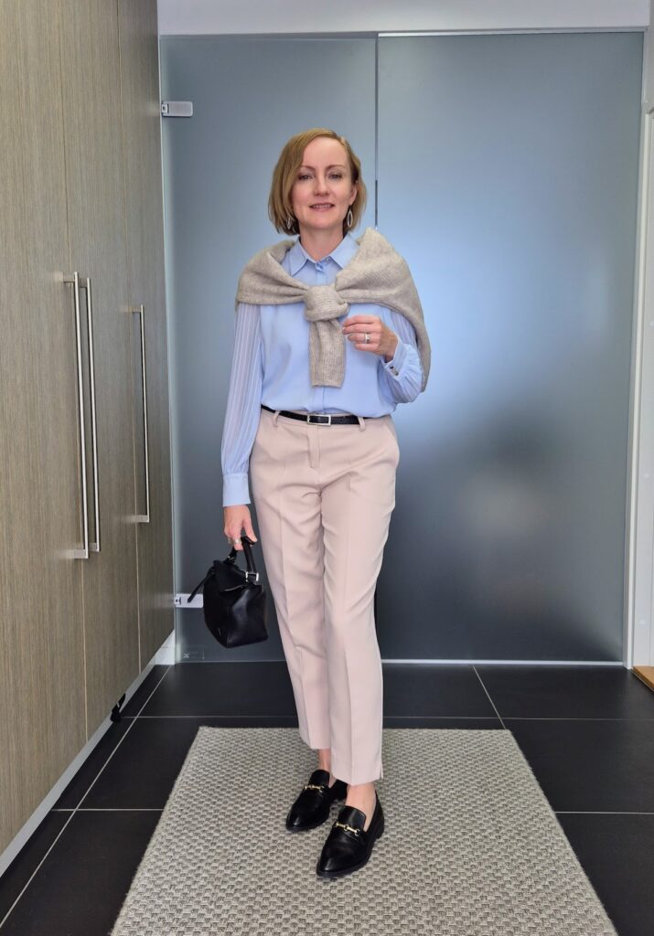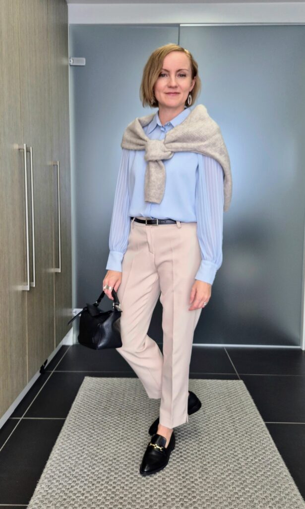 Omasta kaapista kaivettua kuitenkin alkuun. Vaaleansininen kauluspaita Espritiltä on kulkenut jo useamman vuoden matkassani ja sitä tulee käytettyä säännöllisen epäsäännöllisesti. Kesäaikaan pidän enemmän vaaleansinisiä pellavavaatteita ja talvella tätä paitaa, sekä muutamia sinisiä pitkähihaisia. Vaaleansinisistä suorista housuista sekä käsilaukusta olen haaveillut, mutta tähän mennessä ne ovat jääneet vielä ostamatta.