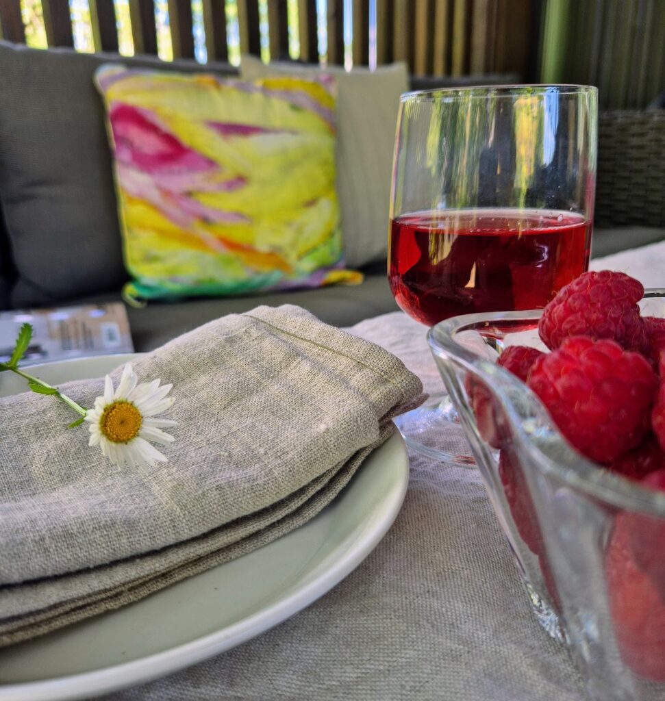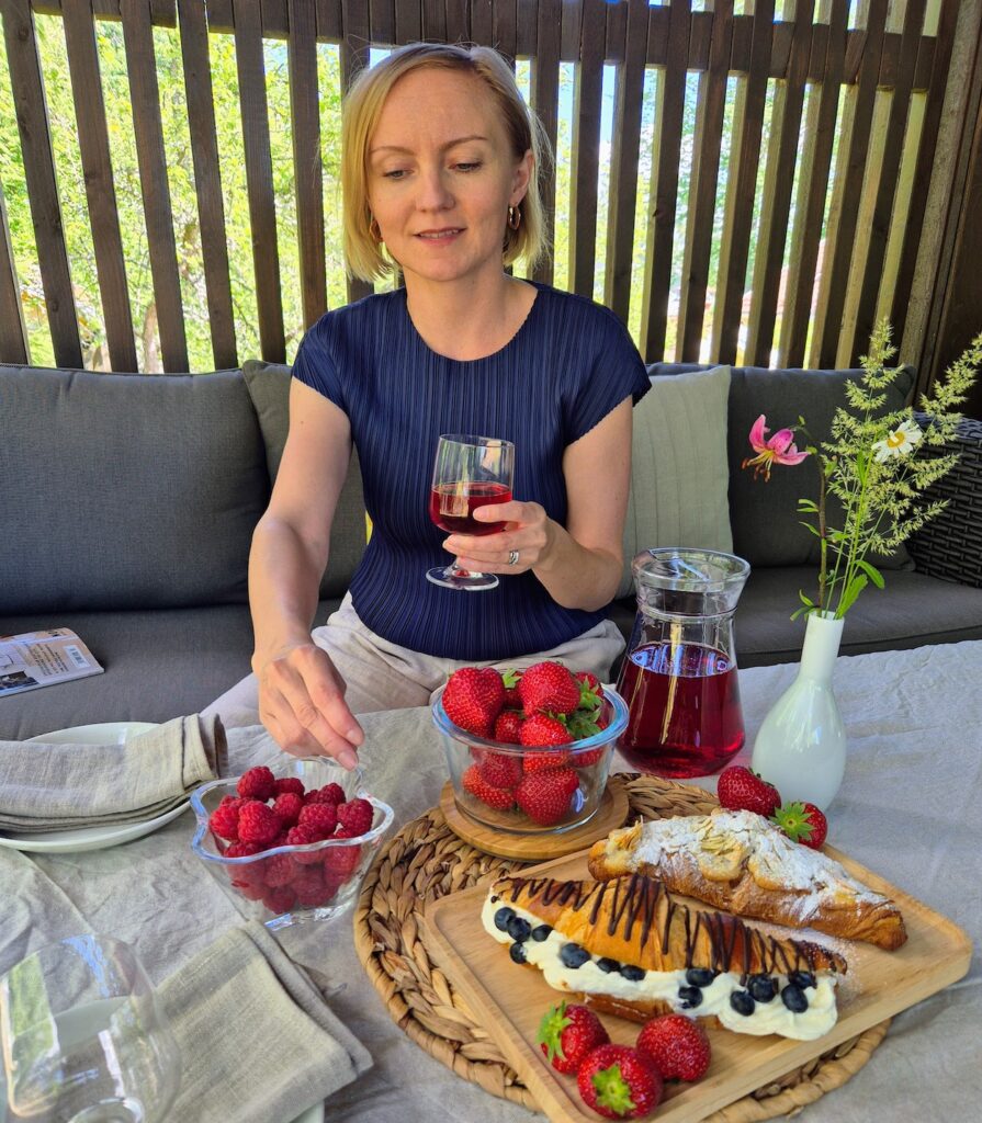 Aamupäivän työt onnistuivat työhuoneesta käsin, ei tarvinnut mihinkään lähteä, joten iltapäivällä kahvihampaan jo kolottaessa kävin laittamassa terassillemme yllärikattauksen. Välillä koululaisella on kavereita kylässä tai luuhaa itse kylillä, mutta tänään oli sellainen perus ”tylsä” päivä, kun kaverit menoissaan ja äiti ja isä vain työskentelivät.