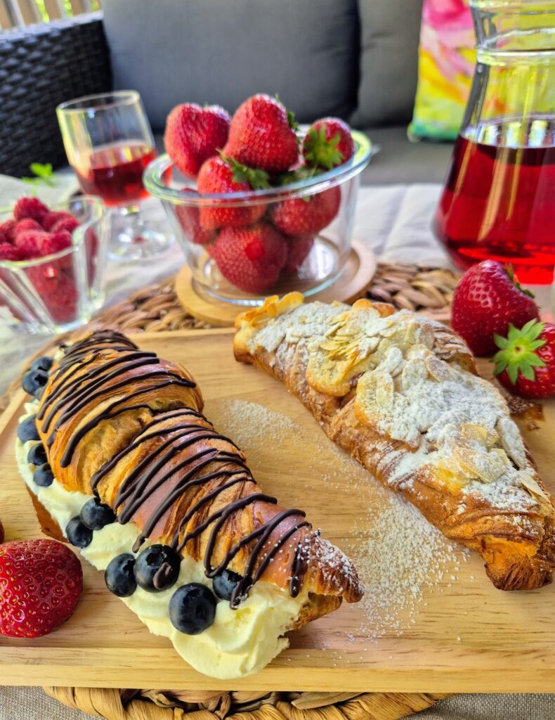 Tällä kertaa löysin isot täytetyt croissantit. Toinen oli mantelicroissant ja toinen täytetty kermavaahdolla ja pensasmustikoilla. Seuraava pysähdys torin kupeessa ja pari ropposta marjoja lähti matkaan. Kotiin mennessä en vielä paljastanut ostoksiani koululaiselle, vaan annoin riisipiirakat syötäväksi.