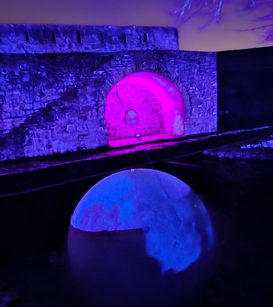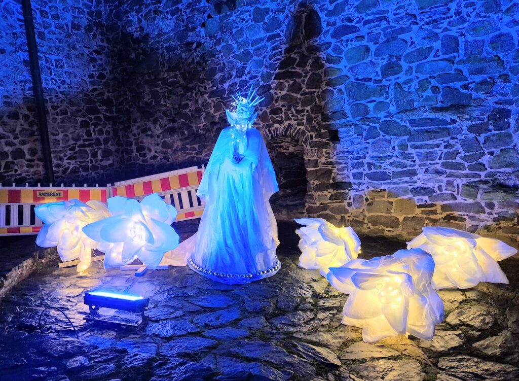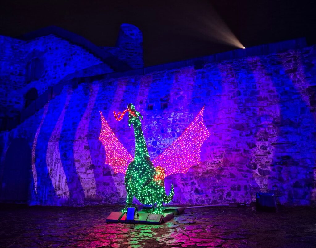 En ollut perehtynyt linnan valotaiteeseen ennalta, joten arvailun varaan nyt jää miksi linnan pihalla oli tällä kertaa mm. jääkuningatar, lohikäärme ja ritari.