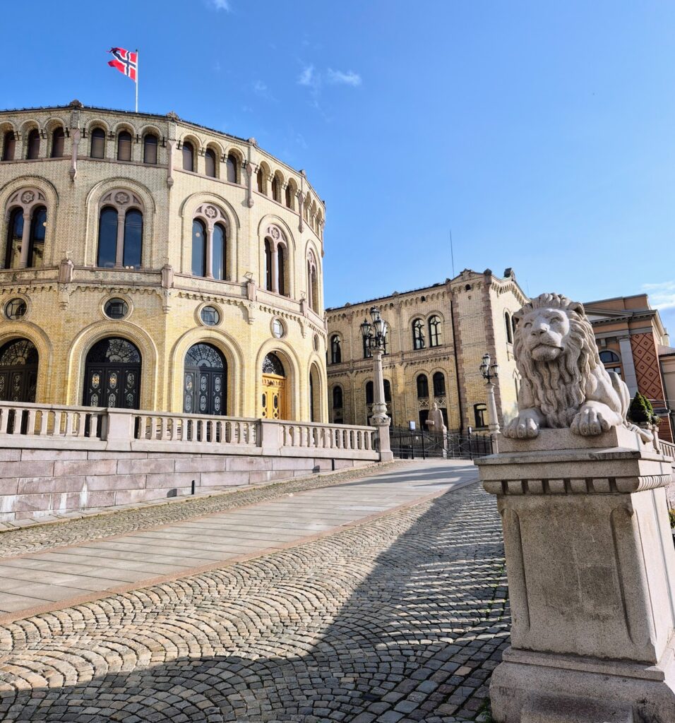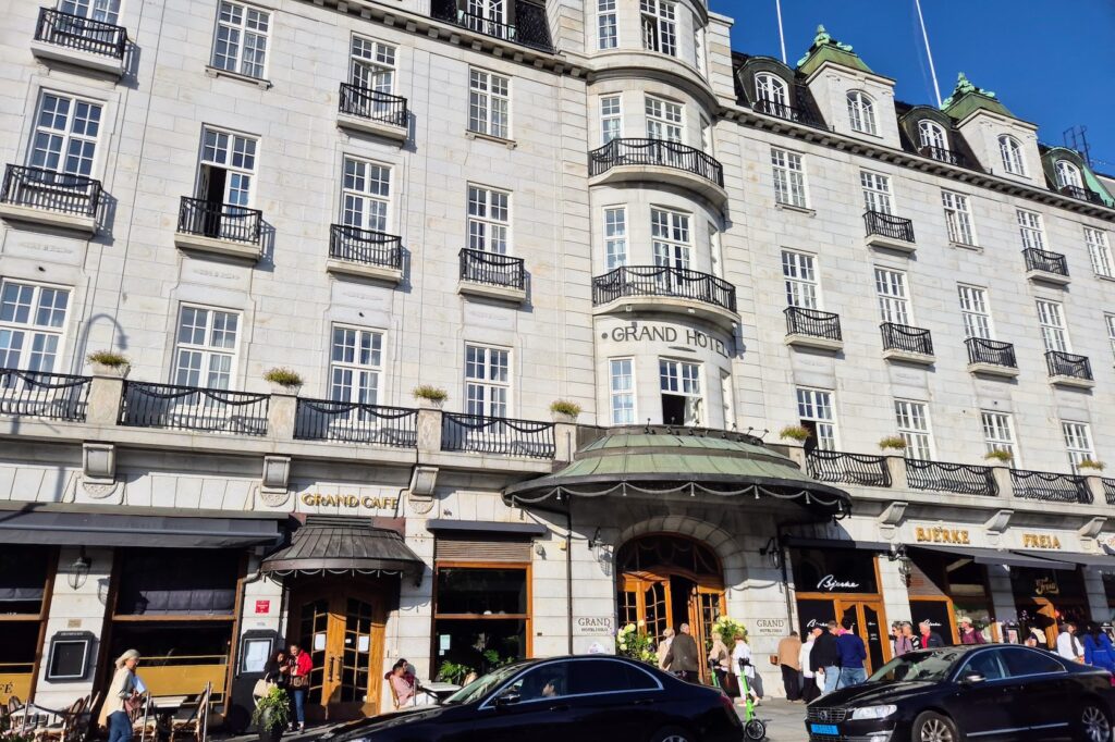 Grand-hotelli oli kivannäköinen, iso rakennus, jossa luonnollisesti nimensä mukaisesti löytyi myös näyttävät sisätilat. Jos minulla olisi ollut aikaa enemmän, olisin voinut kävellä pääkatua loppuun asti, josta olisi löytynyt Kuninkaanlinna. Muuten ehkä olisin tehnytkin niin, mutta elokuun lopussa turistikierroksia ei enää järjestetty, joten linna tuli passattua tällä reissulla. Lähdettyäni Grandista huomasin hienon vanhan rakennuksen melkein vastapäätä ja sehän oli googlen mukaan Norjan parlamenttitalo.