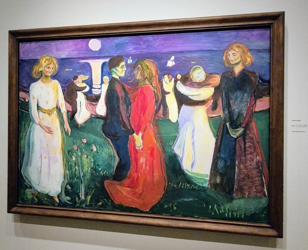 En ehkä ollut perehtynyt Munchin tuotantoon liian hyvin, koska yllättäviäkin töitä löytyi ja näyttelyt olivat minusta laajat. Niitä oli useammassa kerroksessa. Jotkut työt vetivät puoleensa eri lailla. Kuten vaikkapa tämä Elämäntanssi (1899) tässä alhaalla. Siinä on jotain karua ja kaunista, kuin monta tarinaa samassa.