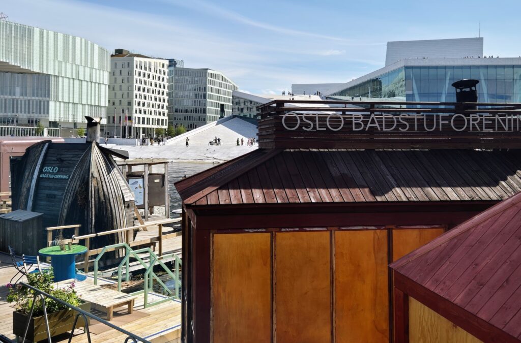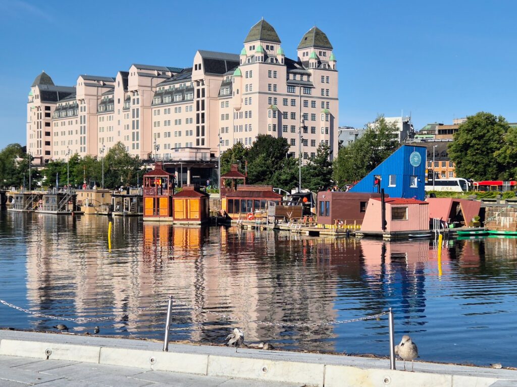 Sää Oslossa oli mitä parhain. Aurinkoinen ja siten myös lämmin. Kävelin linnoitukselta takaisin kohti majapaikkaa. Monia kauniita rakennuksia sattui matkan varrelle ja aivan oopperan tykönä rannassa oli myös monenlaista kelluvaa saunarakennusta vieri vieressä. Ihmisiä näkyi uimapuvuissa menossa kastautumaan suoraan saunasta. Itseltä jäivät saunomiset tällä reissulla välistä, mutta miten kivalta saunat näyttivätkään siinä vieri vieressä kelluskellessa.