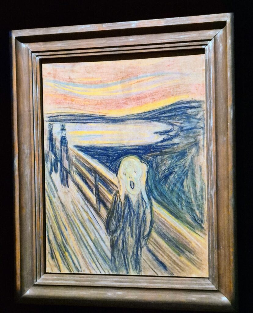 Huuto oli helppo löytää, koska se oli ensimmäisessä näyttelyssä, johon astuin tässä 13. kerroksisessa jättimuseossa. Huuto oli mustassa huoneessa väentungoksen keskellä. Saapumiseni hetkellä esillä oli pastellityö. Eli ei valitettavasti se öljyvärimaalaus, joka ehkä eniten olisi kiinnostanut.
