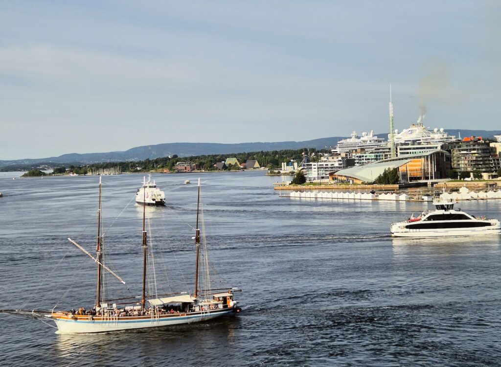 Kiertelin linnoituksen laajoja piha-alueita ja suoranainen maisemien katselupaikkakin löytyi. Maisema avautui merelle eli Oslonvuonoon ja siellä näkyi monenlaista paattia ja iso risteilyalus. Paljon risteilyvieraita (mm. amerikkalaisia) oli kaupungissa käyntini aikaan, enkä ihmettele. Kiinnostavia kohteita riitti.