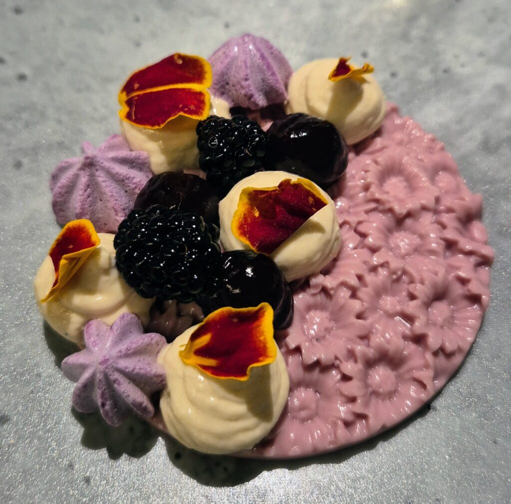 Ja eikö vain olekin jonkinlaista ruokataidetta tuo jälkiruoka!? Jotain muottiahan siinä pohjassa on varmastikin käytetty. Kauniit kukkakuviot ja hetken piti tosiaan ihailla, ennen kuin raaski syödä suihinsa.