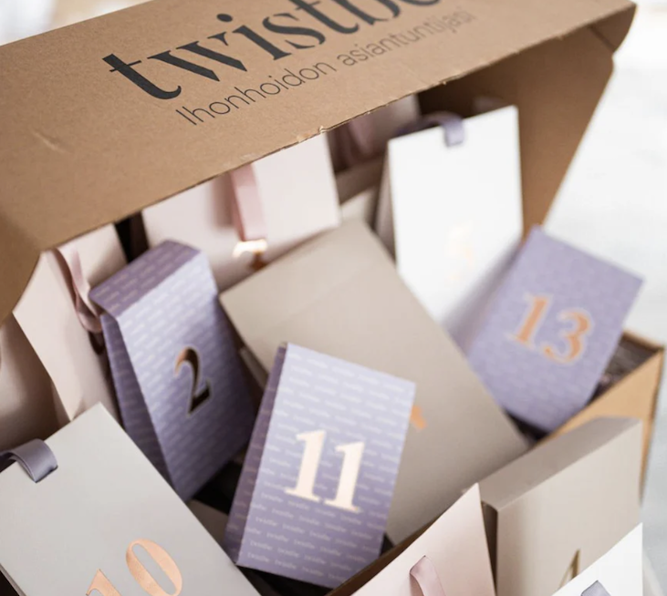Toinen loppuunmyyty suosikkikalenteri on Twistben kosmetiikka joulukalenteri joka sisältää luonnonkosmetiikkaa sekä videotutoriaalit tuotteiden parhaaseen käyttöön. Mielenkiintoista! Mutta tämäkin kalenteri pitää laittaa ensi vuoden syyskuulle muistutukseksi, jos haluaa keritä tällaisen napata itselleen.