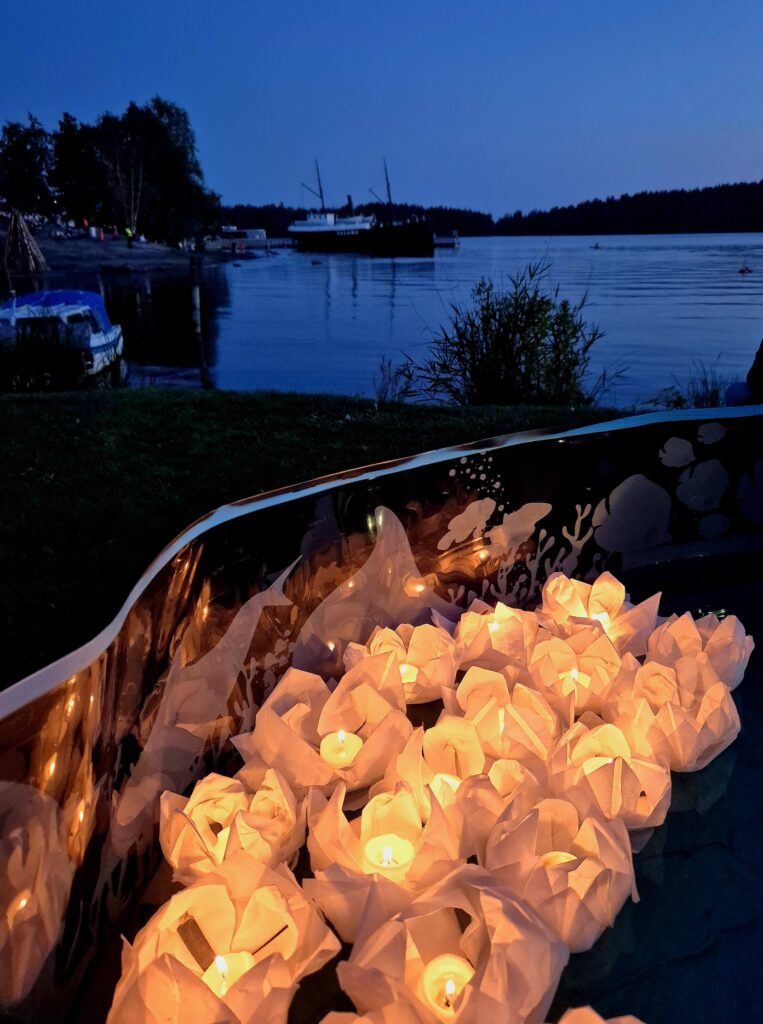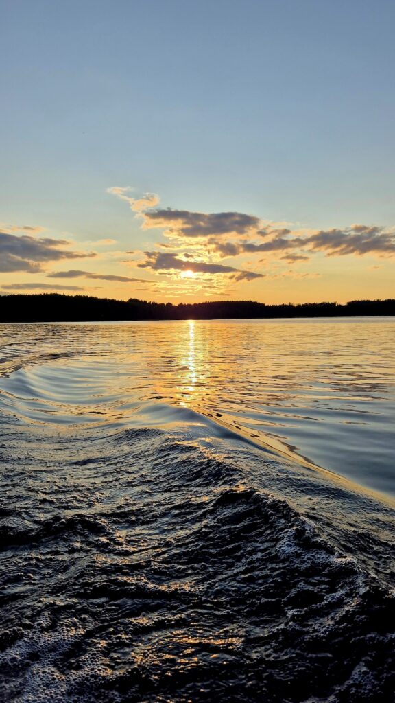 Juhannuksena yllätimme isolla porukalla ystävämme, joka täytti pyöreitä. Järjestimme siis perinteiset yllätysjuhlat! Ja ne onnistuivat hienosti. Juhannusyö oli kaunis, kun veneellä palasimme mökille, jossa yövyimme.