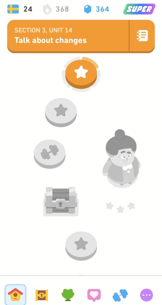 Duolingo villitys on tarttunut muihinkin perheessämme. Koululaiseni aloitti japanin kielen ja minua reippaammin takoo tehtäviä. En edelleenkään maksa minun tai hänen Duolingosta mitään, mutta aika ajoin sitä saa ilmaiseksi 3 päivän kokeilun Super Duolingoon, jossa ei vähene pisteet vääristä vastauksista jne. Juuri nyt minulla on se taas päällä, sen takia kuvankin yläreunassa lukee Super. Sillä ilmaisversiolla pärjää kuitenkin ihan hyvin, jos ei suunnittele tuntitolkulla päivässä opiskelevansa. Silloin virheiden määrä saattaa kasvaa ja jos tekee liikaa virheitä, niin ilmaisversiossa joutuu odottamaan jonkun aikaa, että saa jatkaa opiskelua.